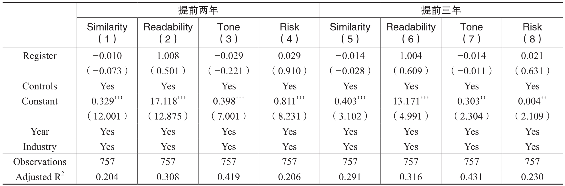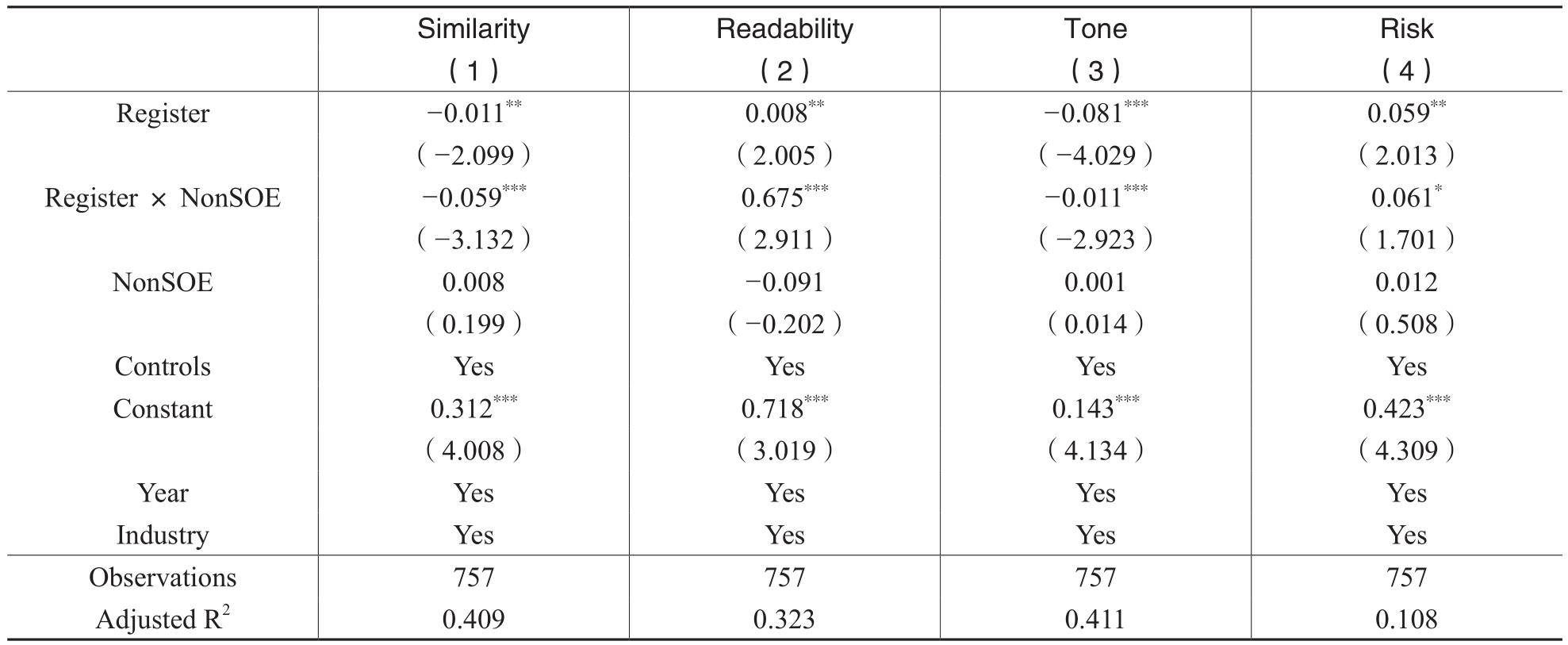 Quality包括反映招股说明书信息披露质量的Similarity、Readability、Tone和Risk;Register表示企业是否实施注册制上市的虚拟变量;X表示一系列控制变量。模型还控制了年度和行业固定效应。由于同一行业内部扰动项往往是相关的,本文基于调整异方差的考虑按行业聚类标准误。