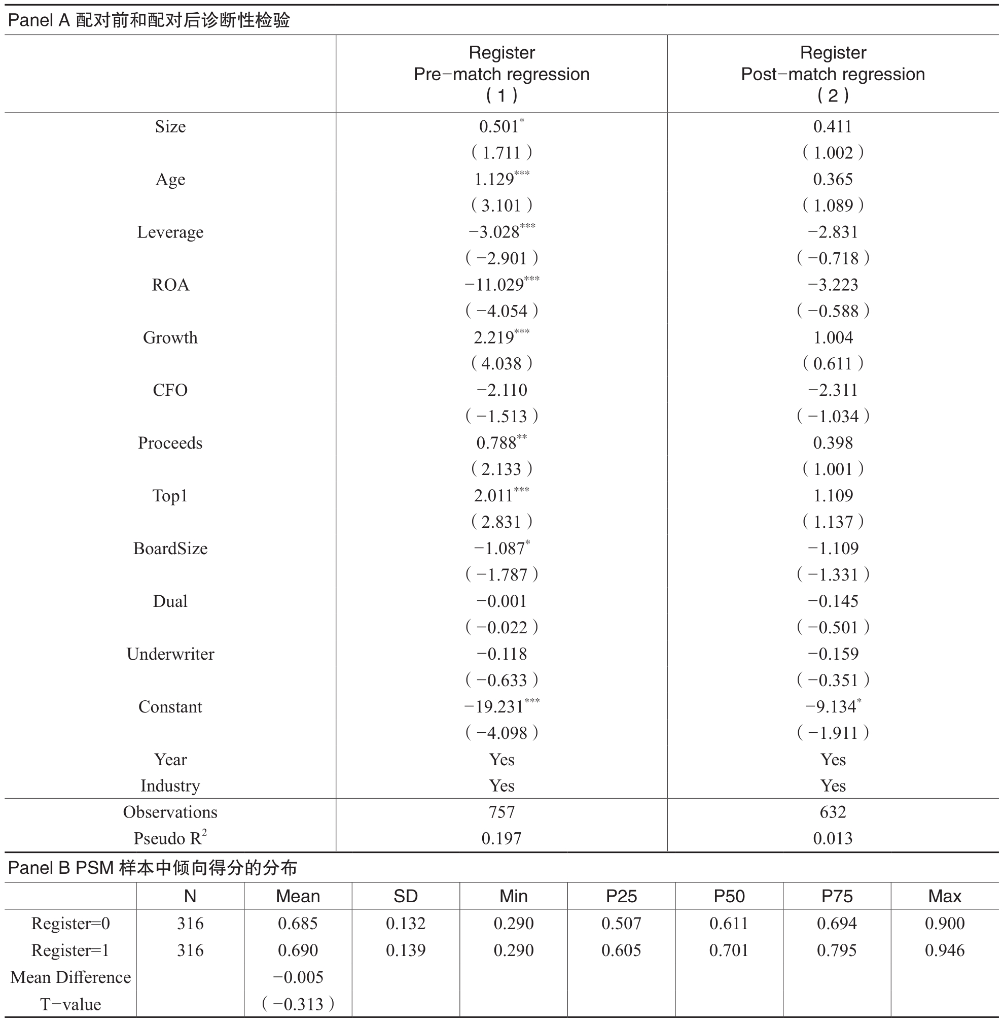 随着时间发展,改革前后创业板IPO公司样本可能存在系统性差异。因此,为了缓解系统性差异问题,本文进一步进行PSM样本分析。本文将模型(1)中的控制变量作为配对变量,使用Logit回归模型来估计倾向得分,采用1:1无放回匹配且将倾向得分控制在±1%之内(5),并采用匹配后的样本重新对模型(1)进行回归。