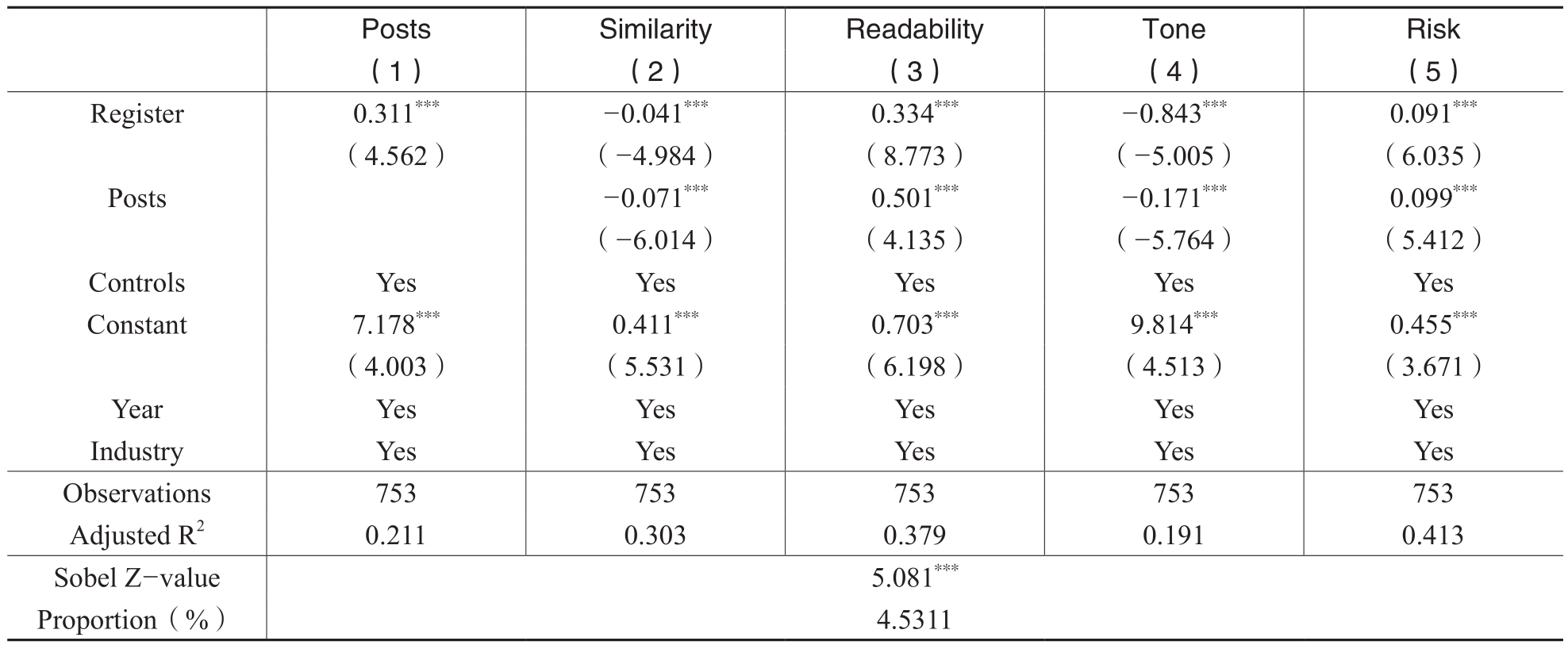 已有研究发现,投资者在股吧等社交媒体上的发言会影响企业决策(傅祥斐等,2023)。注册制改革的实施增加了投资者维护自身权益的可能性,也增强了中小投资者的治理能力。本文借鉴巫岑等(2022)的做法,将投资者在股吧中的发帖量设定为中介变量,研究其对招股说明书信息披露质量的影响。注册制改革后,若投资者对拟上市公司的关注程度有所提高,股吧中的发帖量将进一步增加。本文计算t期和t−1期股吧发帖数量的自然对数之差(Posts),以此衡量投资者关注度的变化。表10报告了检验结果,第(1)列的结果显示,Register的回归系数在1%水平上显著为正,表明在注册制改革后,投资者关注度有所增加。第(2)~(5)列的结果显示,Register的回归系数分别为-0.041、0.334、-0.843和0.091,Posts的回归系数分别为-0.071、0.501、-0.171和0.099,且均在1%的水平上显著,表明投资者关注度增加是注册制改革提高招股说明书信息披露质量的部分中介因素。Sobel检验结果显示,中介效应在1%的水平上显著。因此,该检验表明,注册制改革通过提高投资者关注度使得拟上市公司招股说明书信息披露质量有所提高,从而进一步验证了前文的理论预期。