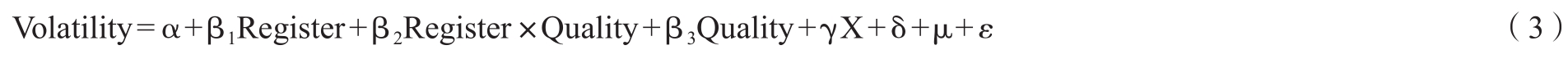Volatility表示股票超额收益波动率。参考白云霞和李璇(2020)的研究方法,本文计算公司上市后(0,20)和(0,120)交易日窗口期的股票超额收益率的标准差(Volatility20和Volatility120)。Register、Quality与基准回归模型一致。X表示一系列控制变量。本文借鉴已有研究(Loughran和McDonald,2013;白云霞和李璇,2020),模型中控制变量包括:公司规模(Size)、公司年龄(Age)、资产负债率(Leverage)、资产回报率(ROA)、公司成长性(Growth)、承销商声誉(Underwriter)、风险投资(Vc)、市场化程度(MarketIndex)、产权性质(NonSOE)。