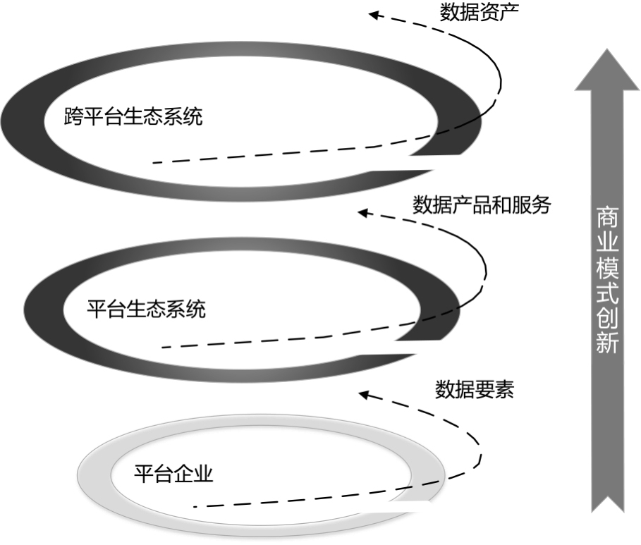 数据要素、数据产品和服务、数据资产的价值形态演变是一个螺旋式上升的过程。数据要素支撑了数据产品和服务、数据资产的演变;数据产品和服务促进了数据要素、数据资产的积累与扩张;数据资产在为数据产品和服务提供合规保障的同时,也为数据要素的共享与市场交易提供了产权基础。与此同时,平台企业、平台生态系统、跨平台生态系统的发展逻辑也符合螺旋式上升的特征。平台企业通过搭建交易场景连接供需双方;平台生态系统通过平台内部资源整合,实现多元主体协同;跨平台生态系统进一步打破单一平台边界,实现多平台资源与功能的融合。无论企业组织形态如何演变,连接各方需求、创造更大价值的底层逻辑始终存在,但是组织模式从“中心化控制”转向“去中心化共生”,价值网络的边界不断扩大,连接的范围和深度显著提升,每一次循环都在更高层次完成了价值逻辑的升级。