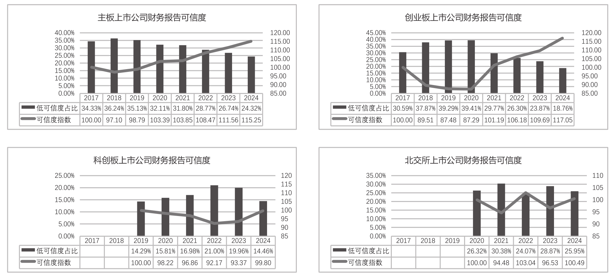 科创板的情况则呈现出一定的复杂性。数据显示,科创板上市公司在财务报告可信度方面(低可信度占比)相对优于主板和创业板市场,显示出其在信息披露规范性方面具有一定优势,但2019~2022年来其可信度指数总体上呈现下降趋势,直到2023年才开始逐步回升。这可能与科创板上市公司的特殊行业定位、高研发创新性和高业绩成长性特征有关,部分上市公司在快速发展过程中可能对财务管理和会计信息披露的规范性不够重视,或者在复杂的市场环境下面临更大的经营波动和财务压力,从而影响了财务报告的可信度。