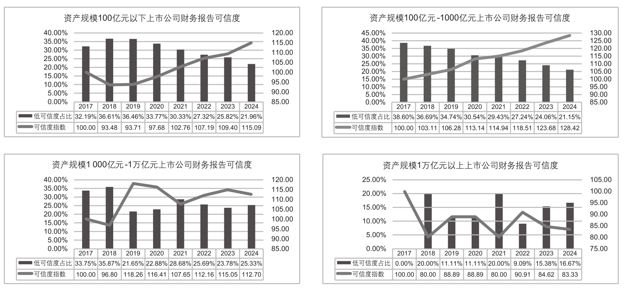 (3) 2017年资产规模1万亿元以上的4家非金融业上市公司,低财报可信度公司为0家。2018年后有万亿元资产规模以上的上市公司出现低财报可信度。本文以2017年度作为基年进行可信度指数的计算,这也导致尽管万亿以上资产规模上市公司低可信度占比低于其他资产规模组,但其可信度指数得分却均低于100分。