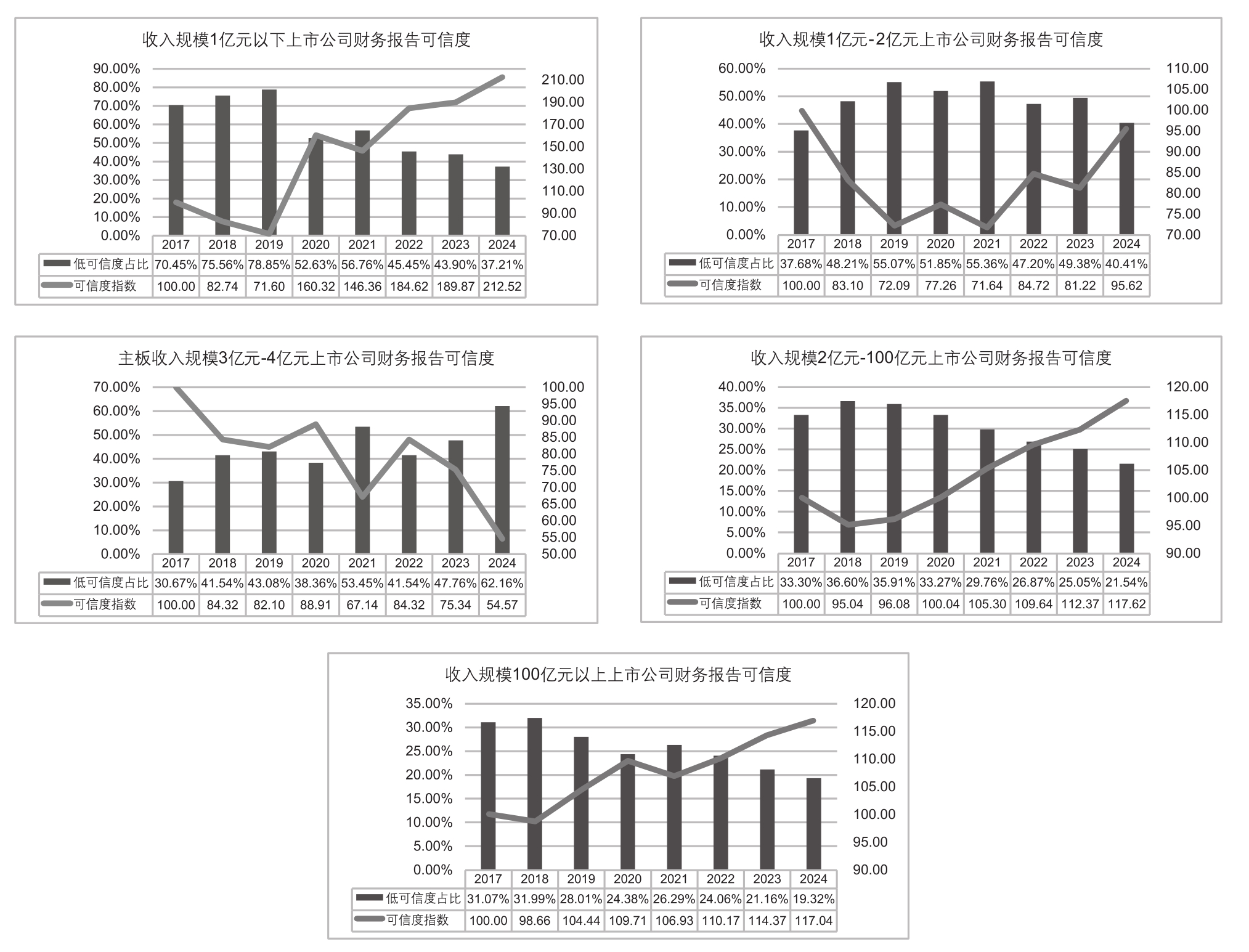 在前期研究(黄世忠和叶钦华,2023)的基础上,本文重点跟踪2023年2月至今A股上市公司会计信息质量变化情况。为了保持指数连贯性及可比性,仍然选取2017~2024年期间八个年度作为分析周期,从市场总体、上市板块、企业性质、行业特征、资产规模、收入规模、利润规模、市值规模、市场指数成分股等不同维度对上市公司财务报告可信度指数变化情况进行分析。