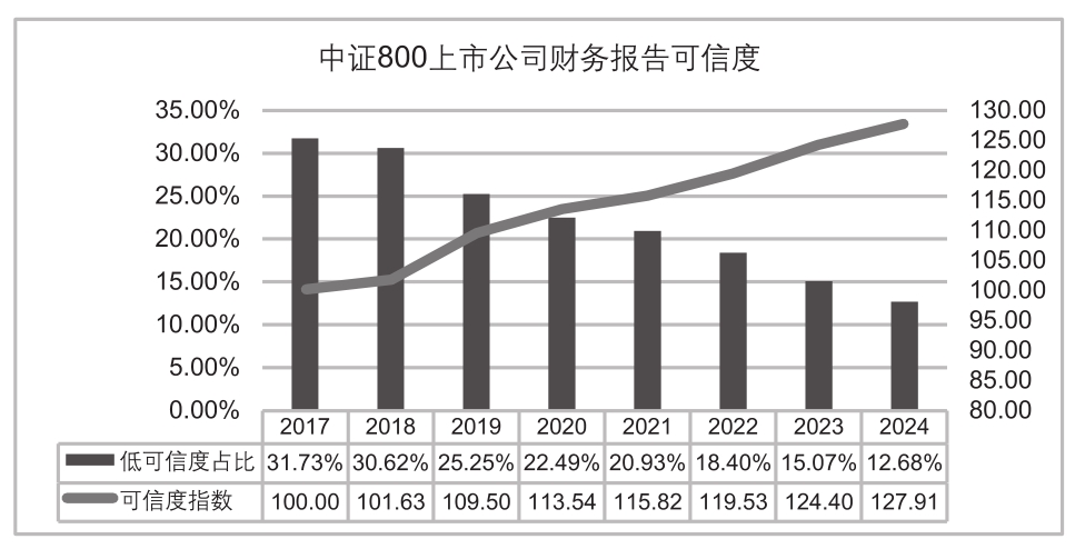 1.基础性实。基于“五维度”模型的可信度指数,经过长达八年(2017~2024年)的回测与实测验证,不仅校验了模型的准确性和可靠性,还使其能够有效适应市场环境的变化和上市公司财务造假行为的多样性。基于“五维度”模型构建的可信度指数,具备较为扎实的理论基础和技术基础,能够为A股上市公司整体会计信息质量的评估提供有力支撑。