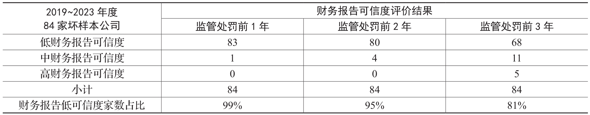 如表2所示,84家坏样本公司在监管处罚前1~3年,财务报告低可信度评价家数分别为83家、80家、68家,即:83家坏样本公司在监管处罚前1年即被评价为“低财务报告可信度”,占比99%;有80家坏样本公司在监管处罚前2年即被评价为“低财务报告可信度”,占比95%;68家坏样本公司在监管处罚前3年即被评价为“低财务报告可信度”,占比81%。可见,财务报告可信度对财务舞弊公司具有较强的识别效果。