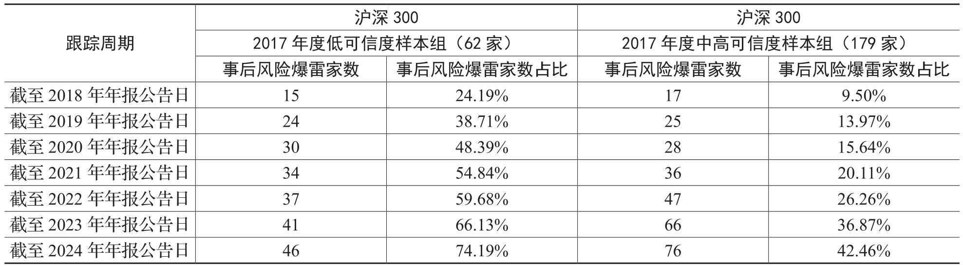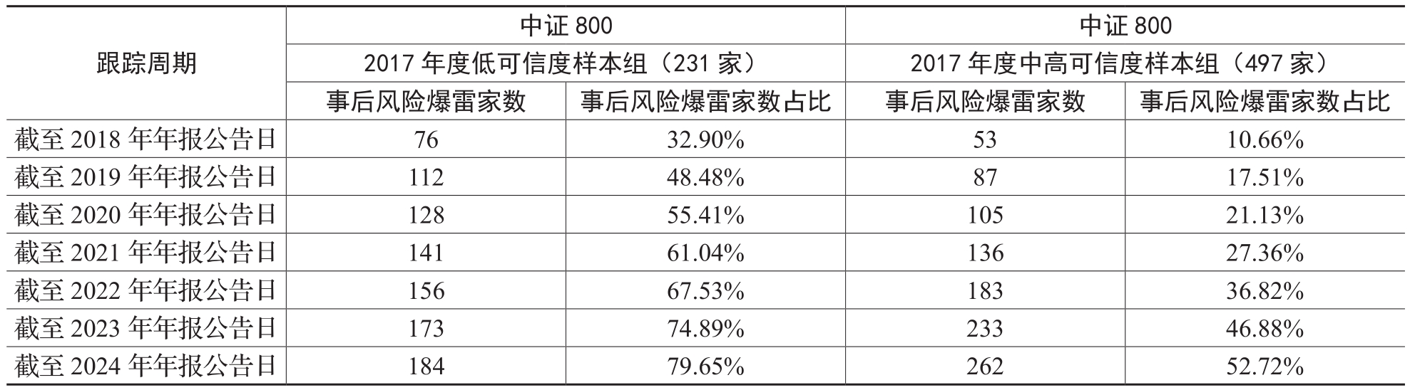 表3与表4系统呈现了沪深300指数和中证800指数样本(剔除金融企业)的财报可信度指标的风险预警效果。2017年沪深300成分股中,低可信度样本62家,中高可信度样本179家。跟踪2018~2025年4月的数据显示,低可信度组风险爆雷比例达74.19%,显著高于中高可信度组的42.46%。风险爆雷定义为发生以下任一事件:舞弊处罚、非标审计意见、立案调查、债券违约或会计违规(不含舞弊处罚)。同样地,在2017年度中证800成分股中,低可信度样本组有231家、中高可信度样本组有497家。跟踪2018年至2025年4月的数据显示,低可信度组风险爆雷比例达79.65%,显著高于中高可信度组的52.72%。这一分析结果证实,财务报告可信度指标能够在风险事件发生前,甄别高风险样本公司并发出有效预警信号,为监管机构和投资者提供了重要的决策参考依据。