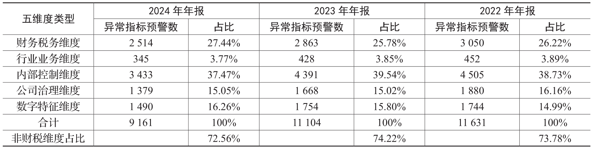 表5 2022~2024年低财务报告可信度公司舞弊信号维度分布