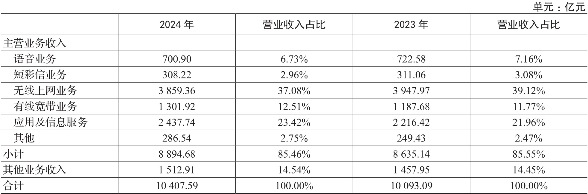 表2 中国移动营业收入结构