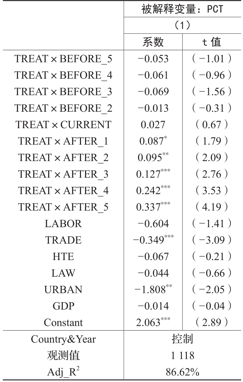模型(1)中,被解释变量为创新国际化(PCT),采用国际专利申请数量加1取对数衡量。基于《专利合作条约》(Patent Cooperation Treaty,简称PCT)的专利申请反映了专利国际竞争力(温军和张森,2018),可以直接体现创新国际化水平(夏先良,2014;韩剑等,2023)。模型(1)的解释变量为TREAT×POST。其中,TREAT是识别处理组的虚拟变量,若特定国家与中国签署了“一带一路”的相关文件则赋值为1,否则为0。POST为特定国家与中国签署“一带一路”相关文件的时间,签署当年及以后年份为1,否则为0。模型(1)中,若TREAT×POST的系数α1显著为正,则假设1成立。