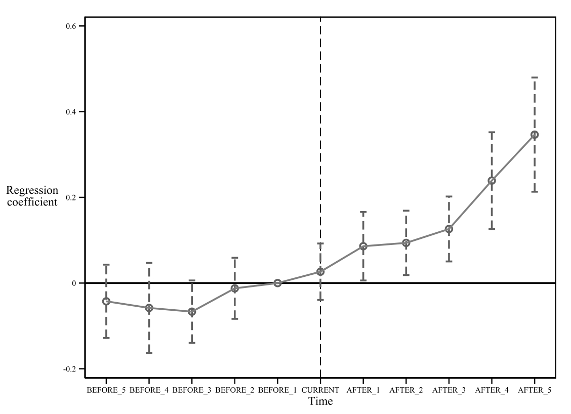 表7报告了使用Stacked DID进行稳健性检验的回归结果。第(1)列TREAT×POST的回归系数显著为正,支持了假设1。在第(2)列创新能力较强的子样本中,TREAT×POST的系数依然显著为正,第(3)列创新能力较弱的子样本中,TREAT×POST的系数不显著,再次支持了假设2。