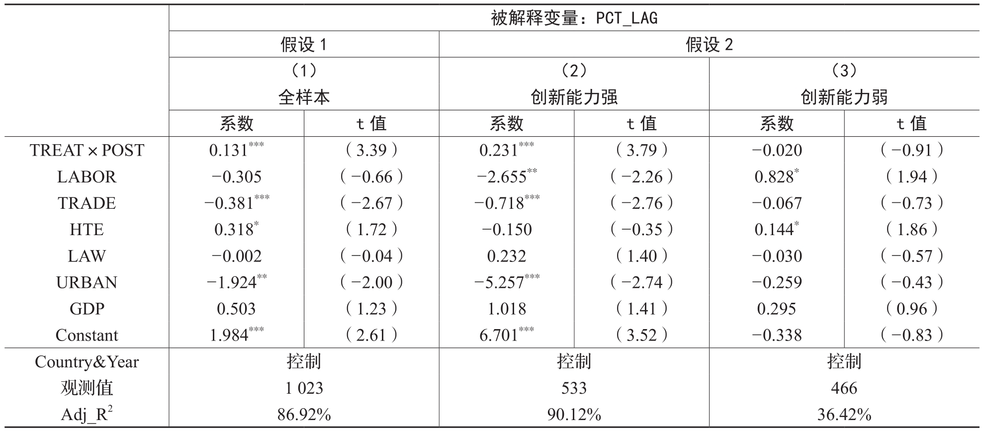 为检验假设2,本文以东道国的创新能力(全球各国的创新指数,源自WIPO数据库)为基础,将样本按国家创新指数中位数区分为高低两个子样本,分别用模型(1)进行检验。