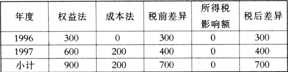 例二、某上市公司从1995年起一直适用33%的所得税税率,所得税采用应付税款法核算。公司于1996年1月1日对华南公司投资4500万元,持股比例为30%,从1998年开始由成本法改按权益法核算。华南公司1996年和1997年的净利润分别为1000万元和2000万元(假设华南公司除了净利润外,无其他所有者权益变动事项),该公司1997年从华南公司分回现金股利200万元,如华南公司所得税率亦为33%。则成本法改为权益法的计算如下: