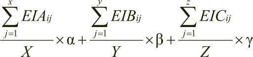 其中:EIA(B、C)ij为第A(B、C)类人员中第j个人对风险指标i的影响程度的打分;EPA(B、C)ij为第A(B、C)类人员中第j个人对风险指标i发生可能性的打分。