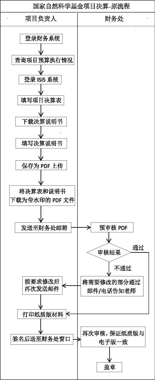 图 1科学基金项目决算原流程程繁琐。决算工作流程繁琐,并且财务系统和科学基金系统对操作规范性要求很高,没有财务基础的项目负责人经常因为误操作导致填报错误或提交失败等问题。