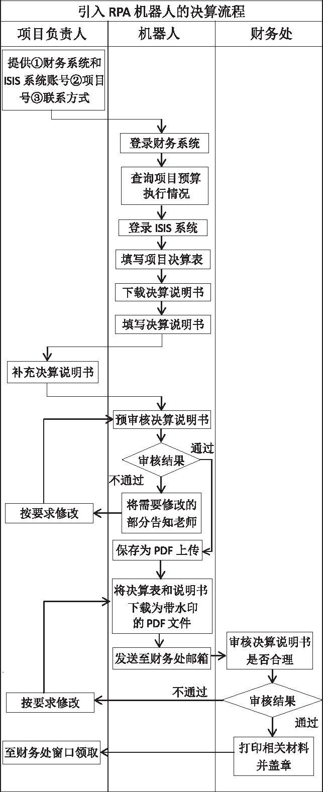 引入 RPA机器人的科学基金项目决算流程如图 2所示,RPA机器人承担了决算流程的绝大部分工作。一方面,项目负责人提供财务系统和科学基金系统账号、项目号和联系方式,机器人自动查询预算执行情况、填写图 2引入 RPA机器人的科学基金项目决算流程决算表和决算说明书、预审核决算说明书、下载决算材料并且发送至财务处邮箱。另一方面,财务人员不再需要人工核对数字,只要审核决算说明书的内容是否合理。如果决算材料符合要求,财务人员即可直接打印并盖章,等待项目负责人前来领取。需要特别指出的是,预审核决算说明书能够排除上述审核不通过的大部分问题;且项目负责人可以在所有结题材料审核通过后到窗口一次性领取全部材料,避免了往返多次的情况。(三)基于 RPA的科学基金项目
