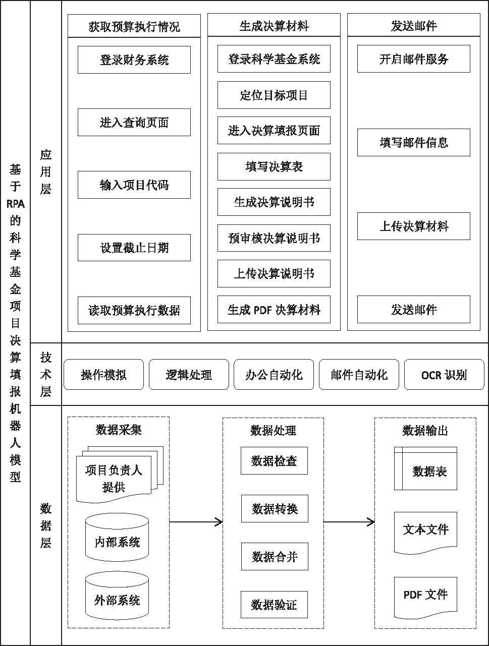 图 3基于 RPA的科学基金项目决算填报机器人模型决算填报机器人模型构建基于 RPA的技术和特点,可将科学基金项目决算填报机器人模型分为数据层、技术层和应用层三个部分,具体如图 3所示。