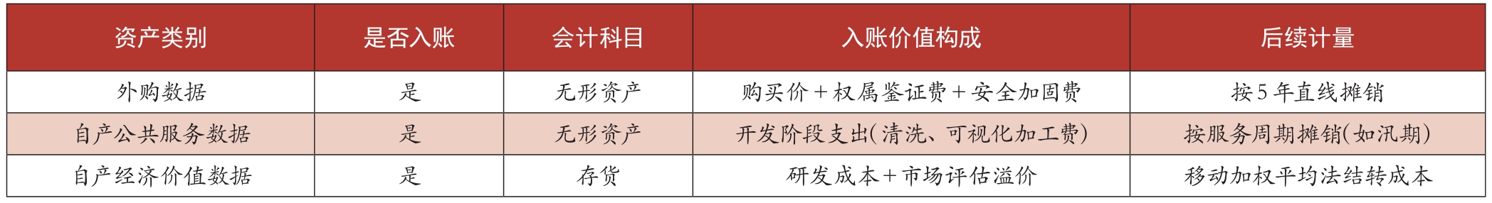 气象数据资产形成源自不同方式,为方便清晰了解气象数据资产来源渠道,基于应用属性和对应权利,将气象数据资产分为五种类型,见表1。结合气象数据资产定义,只有外购数据、自产公共服务数据(主要向社会大众提供天气信息,侧重社会效益,经济属性较弱)和自产经济价值数据(主要向经济主体提供预测信息,服务其经济决策,具有很强的经济属性)可作为数据资产处理,另外两类资产因无法确定“预期能产生服务潜力或经济利益”或“不受主体合法控制”等原因,尚不满足资产确认条件。