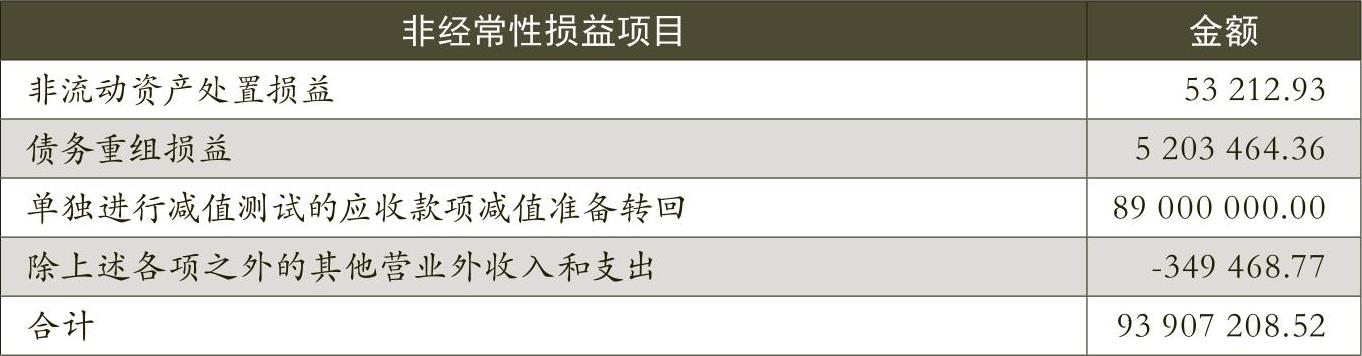 虽然2009年ST国药主营业务无起色,但该年利润总额为55096290.84元。盈利是如何实现的呢?通过ST国药2009年非经常性损益科目表(表9)可发现“单独进行减值测试的应收款项减值准备转回”科目有8900万元的金额。而整个报表关于该8900万元的说明并不详细,只有“收回债权”四个字。