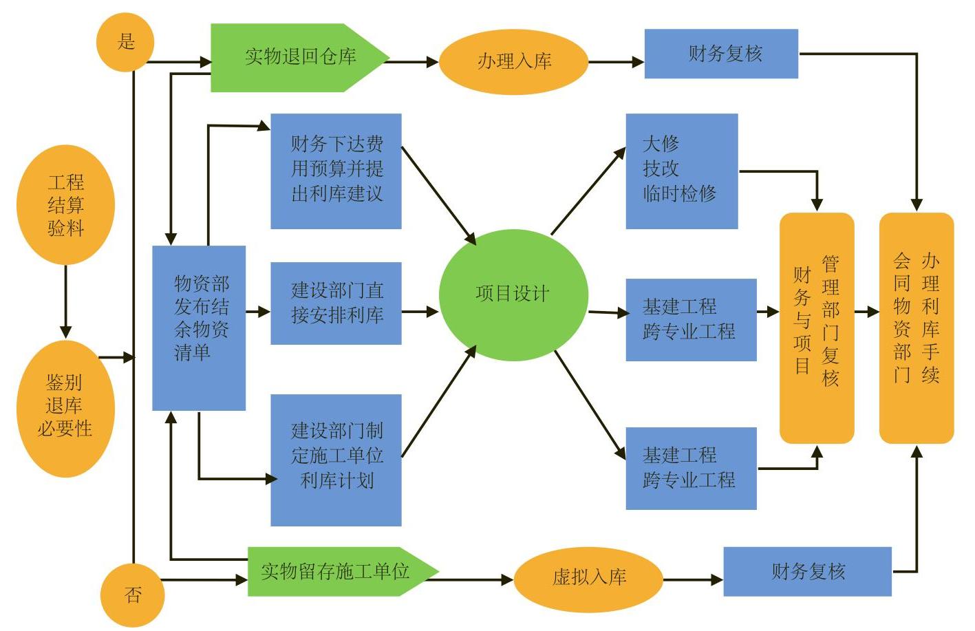 通过物资盘点、调查摸底,深入查找工程结余物资的成因和构架以及可利用的途径,剖析问题根源,映射工程管理问题,提出建设性措施,把业务、财务、稽核、管控有机融合,明晰利库环节的工作重心,推倒原有冗余流程,再造精练缜密、融联贯通的操作流程(见图1)。