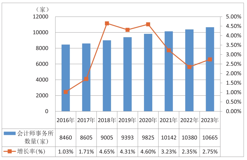 图2 2016—2023年会计师事务所数量变化及增长率
