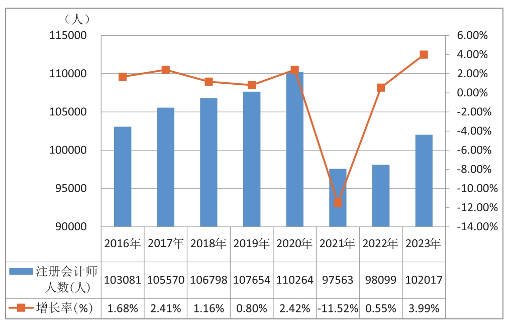 图5 2016—2023年注册会计师数量变化及增长率