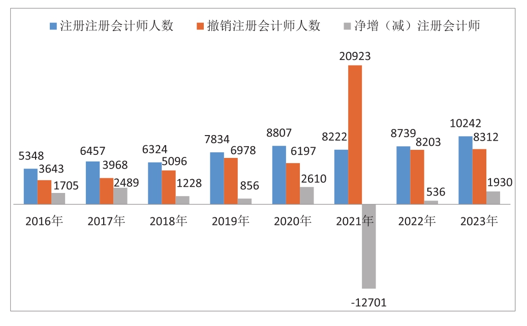 图6 2016—2023年注册会计师的注册、撤销情况对比