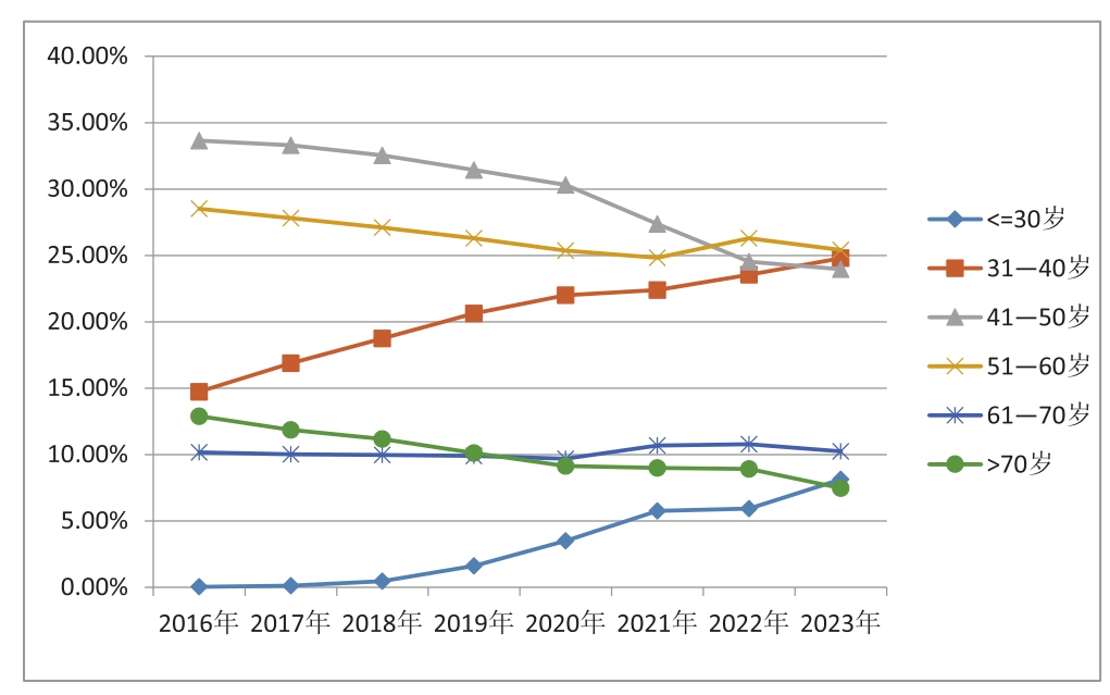 图7 2016—2023年全国注册会计师年龄变化情况