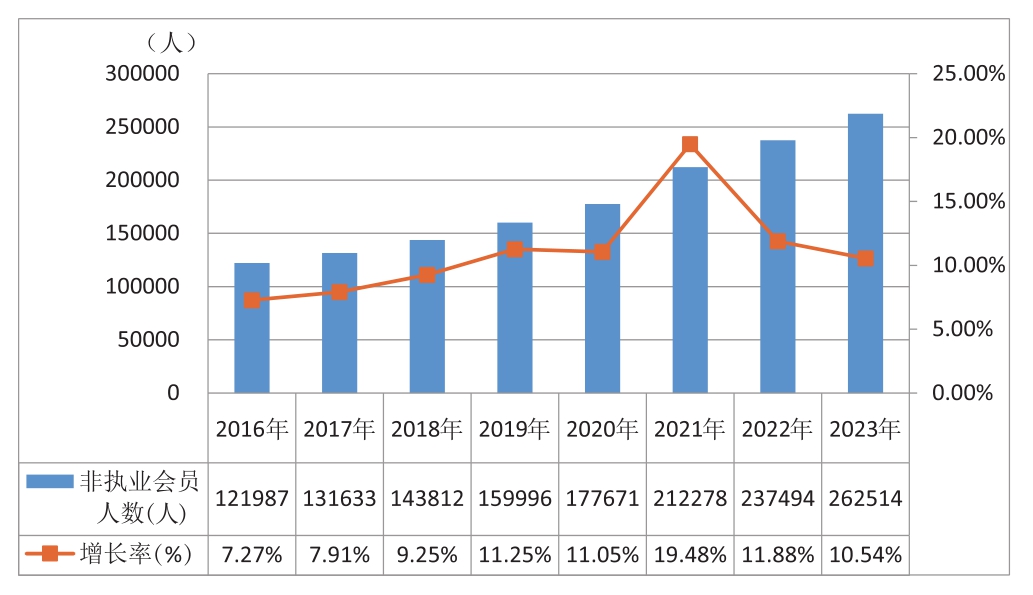 2016—2023年,非执业会员数量一直稳步上升,年增长率均在7%以上(见图10)。其中:2023年的非执业会员人数增长率为10.54%,非执业会员服务工作的重要性日益凸显。
