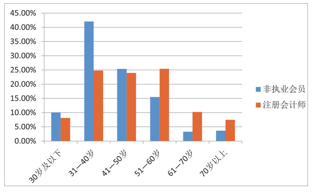 (二)非执业会员年龄分布。在境内非执业会员中,30岁及以下的26494人,占比10.12%;31—40岁的110066人,占比42.04%;41—50岁的66490人,占比25.40%;51—60岁的40582人,占比15.50%;61—70岁的8600人,占比3.29%;70岁以上的9555人,占比3.65%。