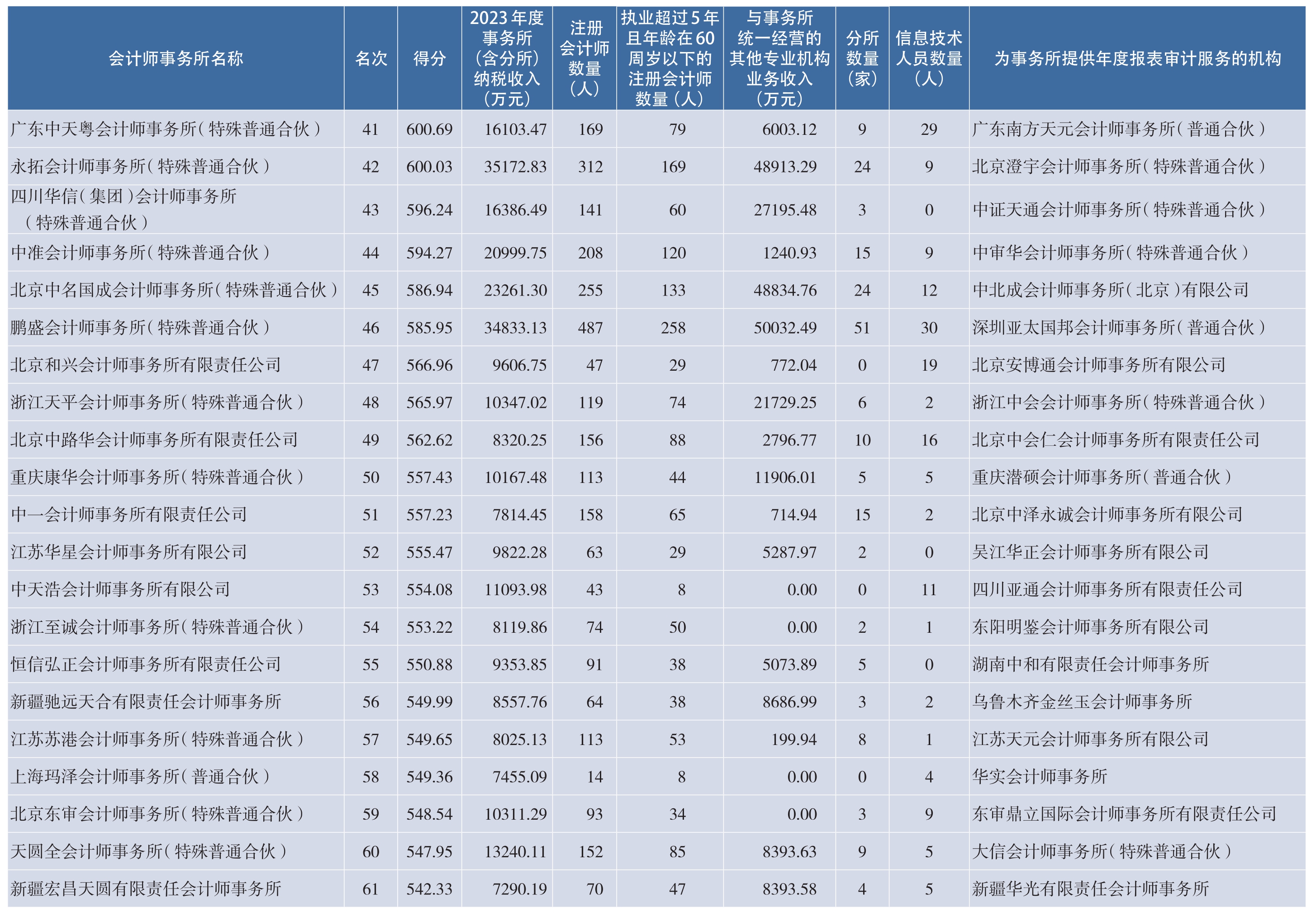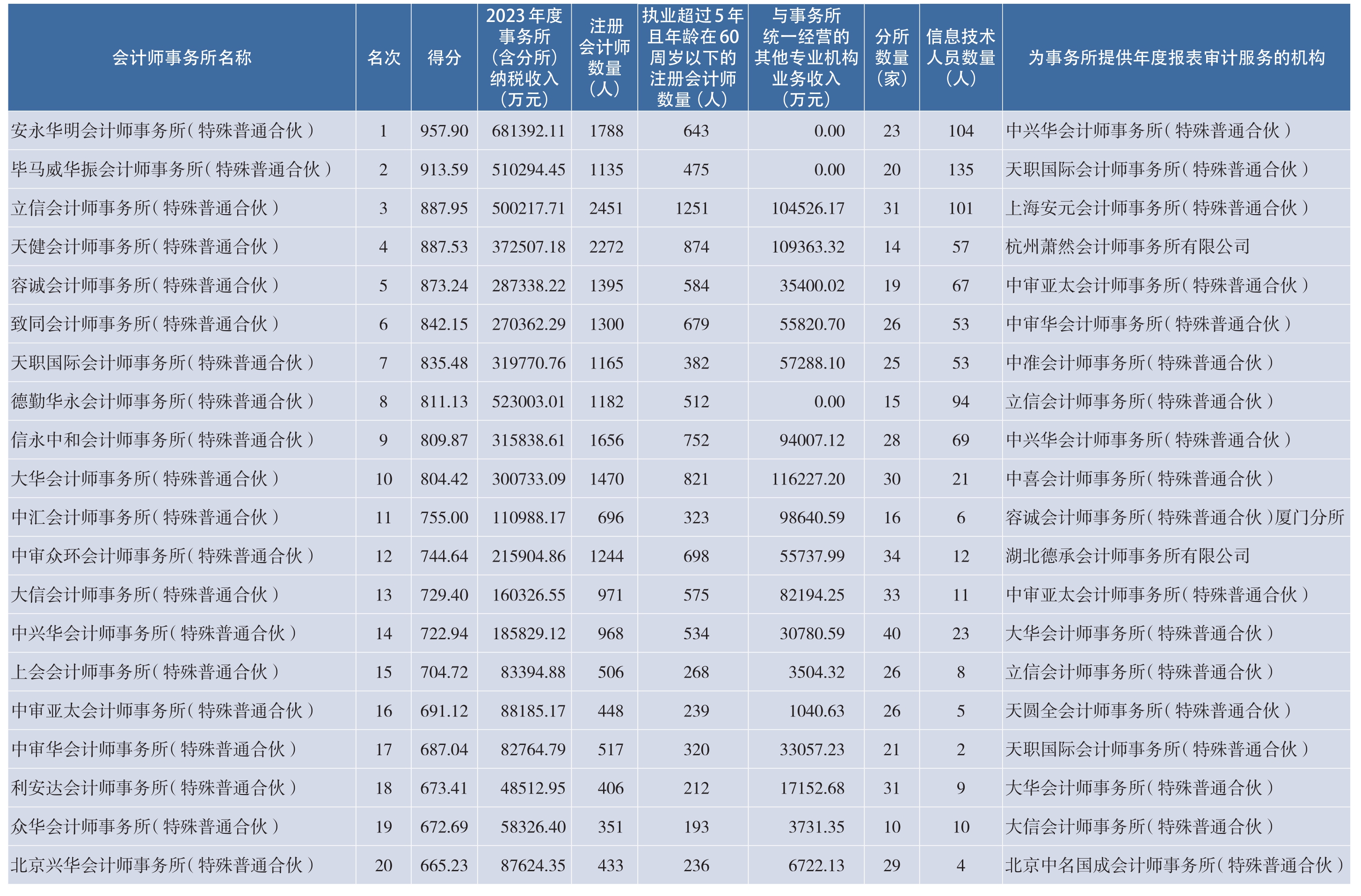 注:1.本排名信息中披露的事务所业务收入为2023年度会计师事务所(含分所)纳税收入