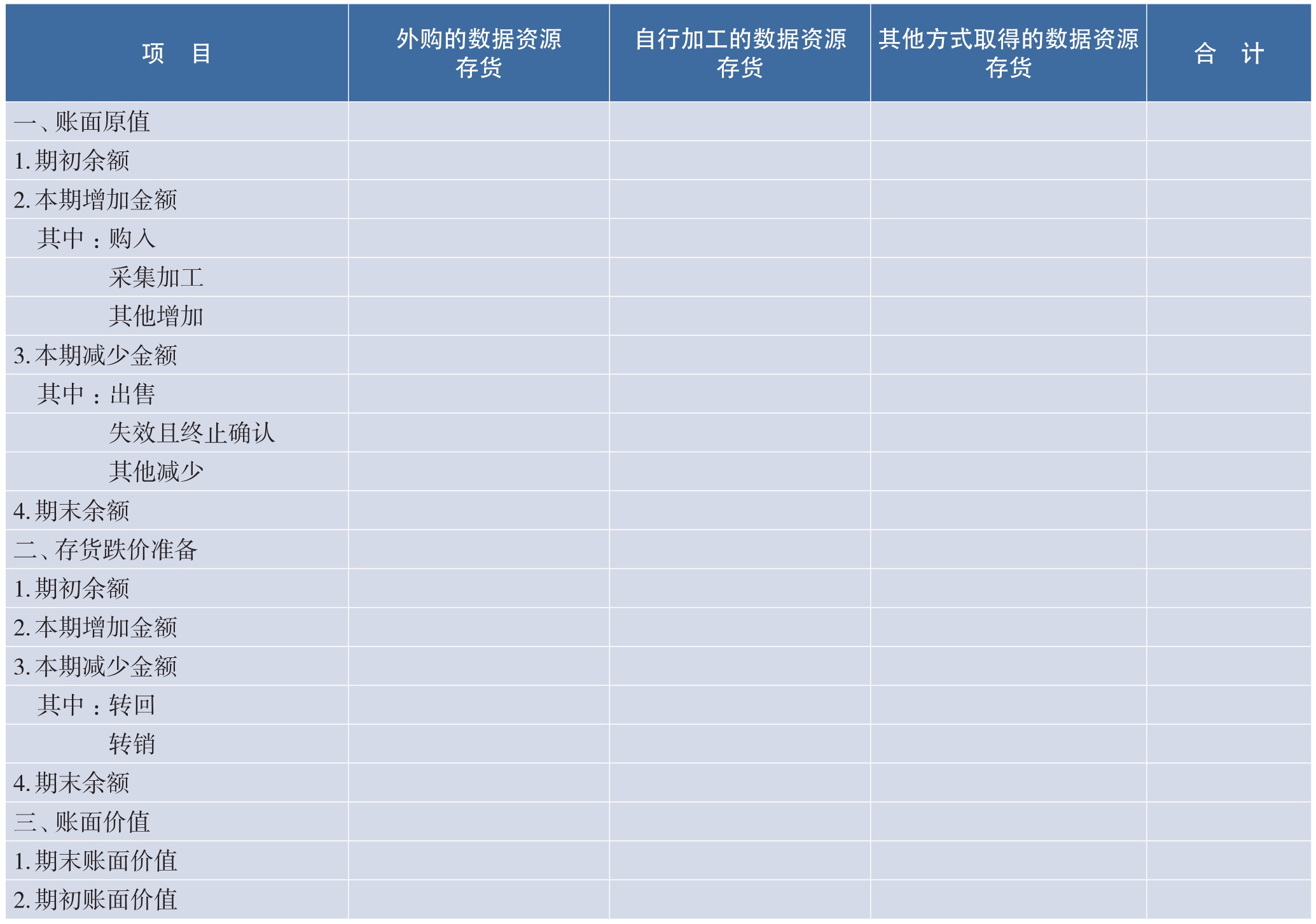 (1)企业应当按照外购存货、自行加工存货等类别,对确认为存货的数据资源(以下简称数据资源存货)相关会计信息进行披露,并可以在此基础上根据实际情况对类别进行拆分。具体披露格式如下:
