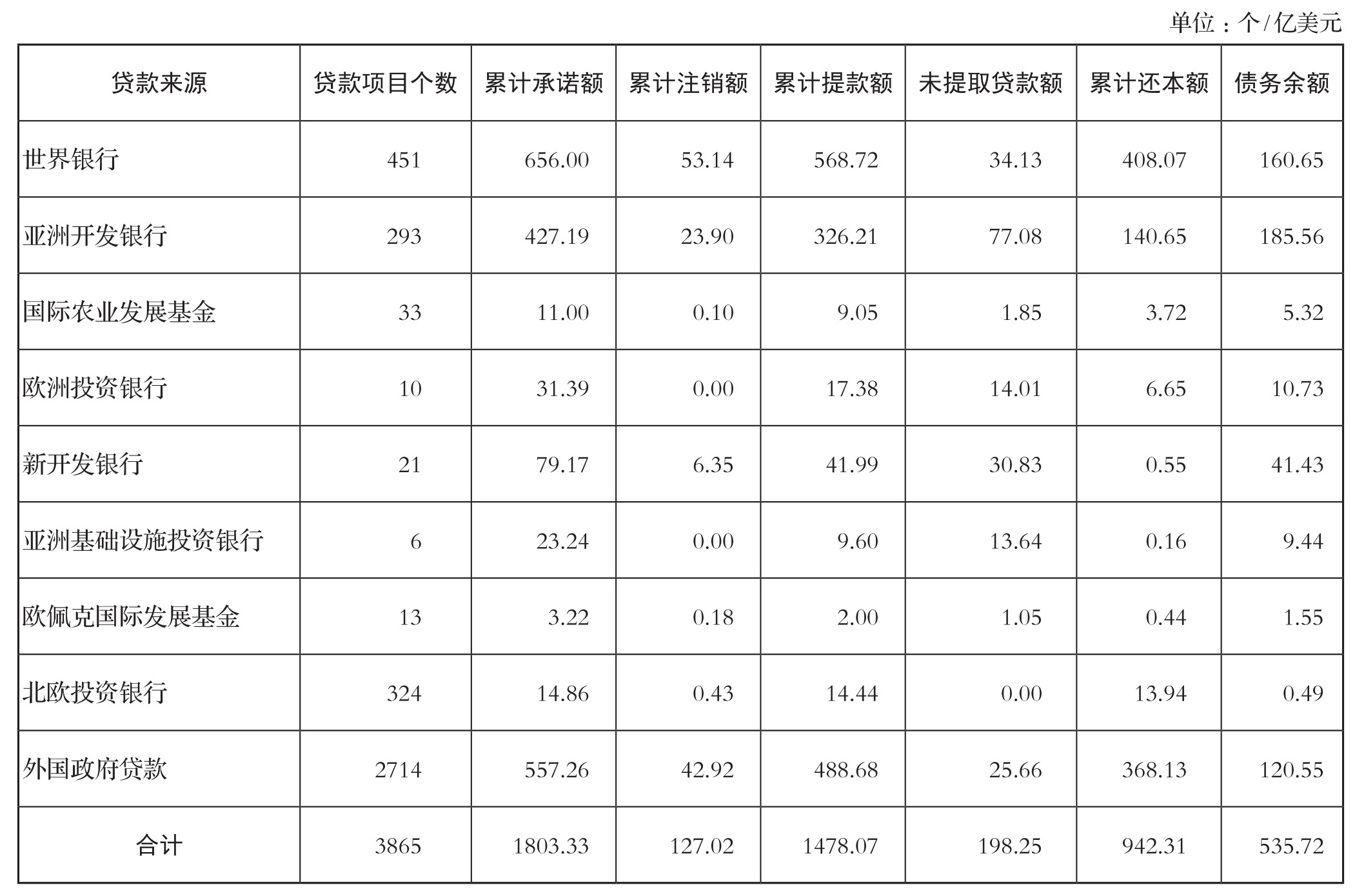 (一)基本情况。截至12月31日,利用国际金融组织和外国政府贷款累计承诺额约1803.33亿美元,累计提款额约1478.07亿美元,累计归还贷款本金约942.31亿美元,债务余额(已提取未归还贷款额)约535.72亿美元。贷款用于支持我国3865个项目,涉及疫情防控、大气污染防治、节能环保、应对气候变化、绿色发展、乡村振兴、交通、城建、教育、医疗卫生、灾后重建、智慧农业等领域(见表1)。