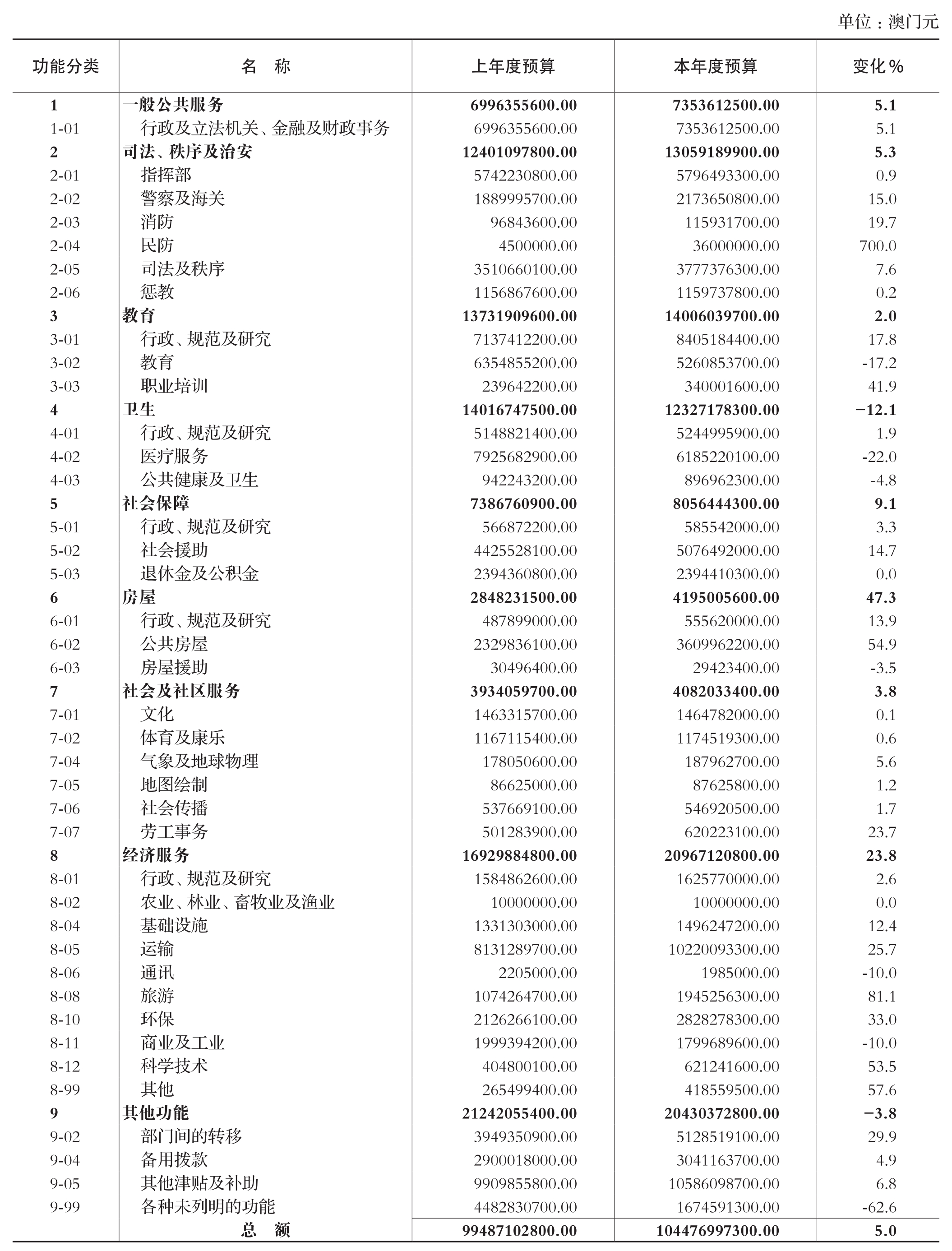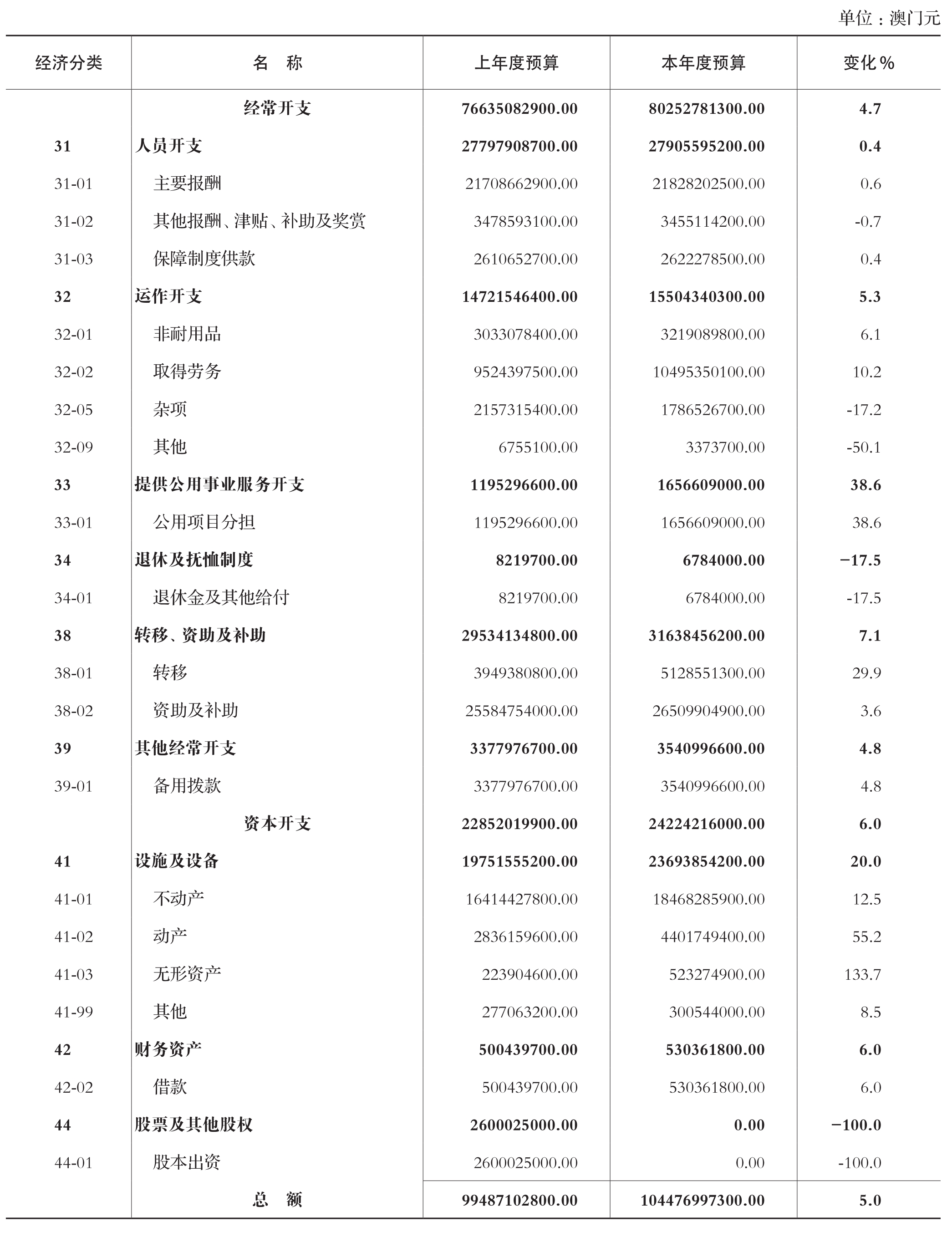 一、二零二三年财政年度澳门特别行政区一般综合预算的开支总额为$104,476,997,300.00(澳门元壹仟零肆拾肆亿柒仟陆佰玖拾玖万柒仟叁佰元)。