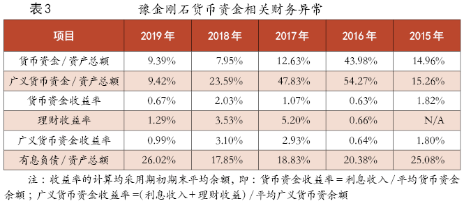 表2和表3列示了豫金刚石货币资金(广义货币资金指上市公司真正拥有的货币资金,即“货币资金”与理财资金的合计数,具体包括库存现金、银行存款、其他货币资金和其他流动资产中的银行理财产品;有息负债包括短期借款、长期借款、应付债券、一年内到期的非流动负债和长期应付款)相关的财务数据和财务异常,主要涉及三类相关联的科目:一是货币资金及相关的理财余额等科目;二是持有资金对应的利息收入科目;三是高存高贷现象涉及的债务科目。