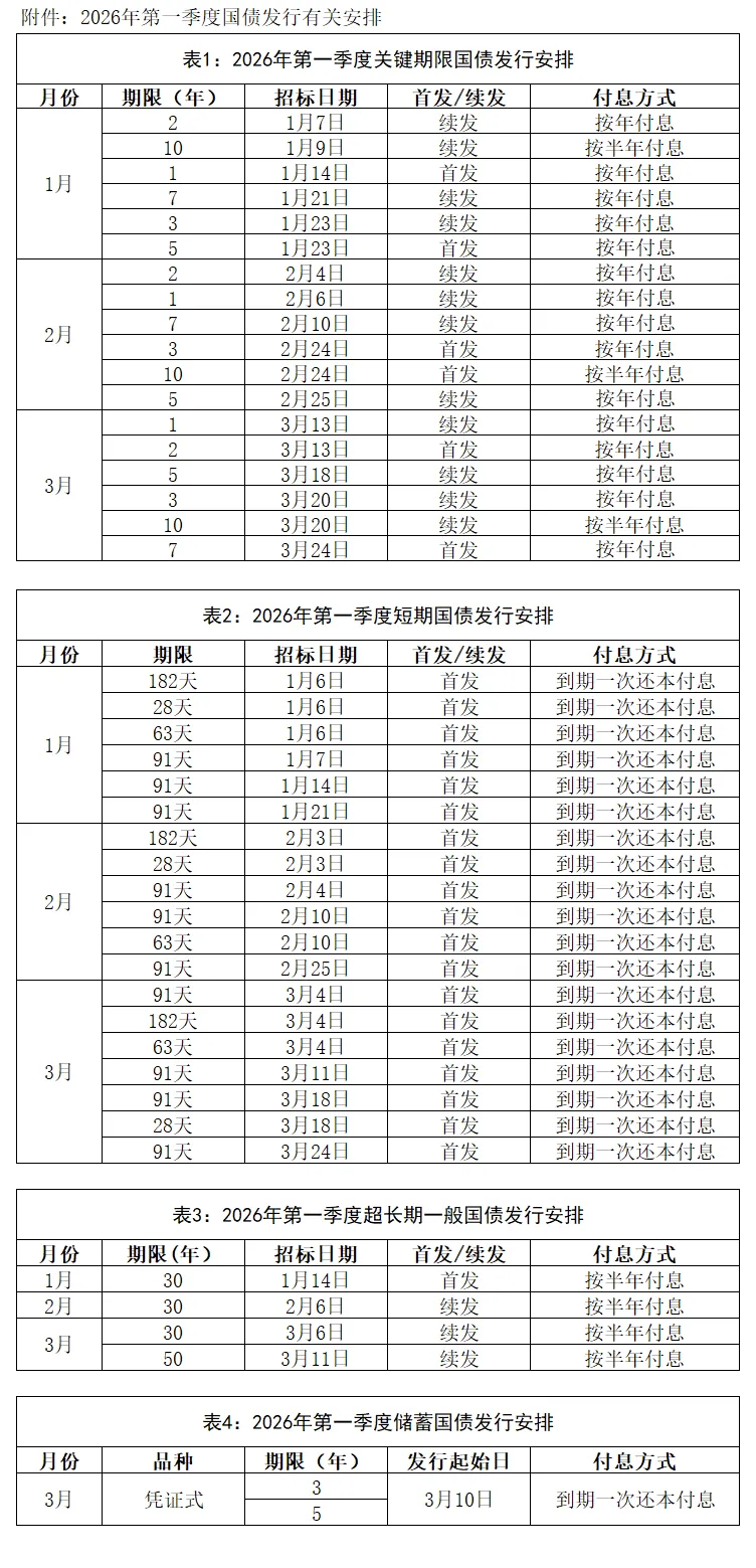 现公布2026年第一季度关键期限国债、短期国债、超长期一般国债、储蓄国债发行有关安排(见附件)。执行中如有变动,以届时国债发行文件为准。