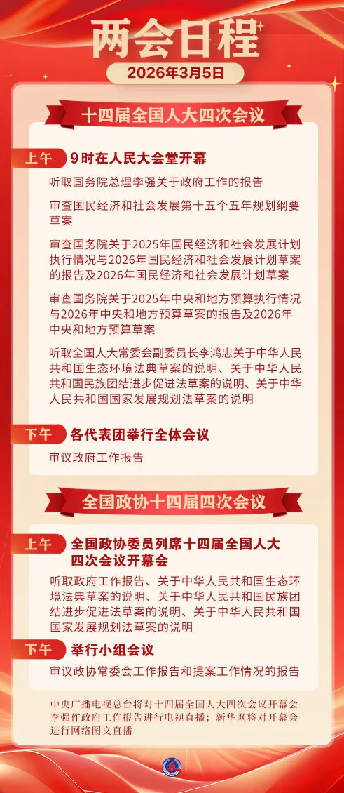 十四届全国人大四次会议5日上午9时在人民大会堂开幕,听取国务院总理李强关于政府工作的报告,审查国民经济和社会发展第十五个五年规划纲要草案,审查国务院关于2025年国民经济和社会发展计划执行情况与2026年国民经济和社会发展计划草案的报告及2026年国民经济和社会发展计划草案,审查国务院关于2025年中央和地方预算执行情况与2026年中央和地方预算草案的报告及2026年中央和地方预算草案,听取全国人大常委会副委员长李鸿忠关于中华人民共和国生态环境法典草案的说明、关于中华人民共和国民族团结进步促进法草案的说明、关于中华人民共和国国家发展规划法草案的说明。下午,各代表团举行全体会议,审议政府工作报告。