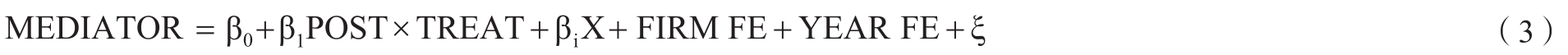 上述模型中,MEDIATOR为机制变量,包括待处理诉讼事项(PL)和交易成本(TCOST)。前者以企业未决诉讼标的金额加1的自然对数衡量,通过手工收集财务报告中“预计负债——未决诉讼”的二级明细科目余额获得;后者采用期间费用与企业资产总额之比来衡量。模型(3)为第一阶段估计结果,旨在检验司法效率对待处理诉讼事项和交易成本两个机制变量的影响。进一步地,根据模型(3)的回归结果,可以得到MEDIATOR的预测值MEDIATOR_if tted,分别对应PL_fitted和TCOST_fitted,将其替换模型(1)中POST×TREAT,由此得到第二阶段的回归模型(4),以此检验司法效率对企业商业信用融资的两个作用机制。模型(3)和(4)中其他变量定义与模型(1)相同。