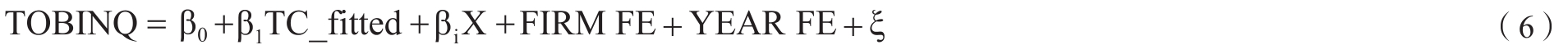 供应商作为企业重要的外部利益相关者,其行为决策不仅会对企业生产经营、财务决策产生影响,还会对公司价值产生较大影响。前文实证检验了繁简分流改革试点对企业商业信用融资的影响,发现司法效率提升显著增加了企业商业信用融资,本部分进一步考察繁简分流改革试点对公司价值的影响,进而考察商业信用融资是否为司法效率提升公司价值的重要途径。鉴于此,构建如下双重差分模型: