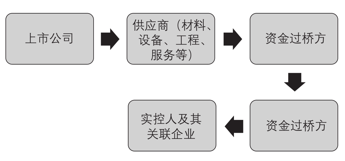 实控人违规占用资金包括余额占用和发生额占用两种类型。实控人余额占用主要是虚构财务报表中货币资金余额以隐瞒实控人及其关联方的资金占用;或者不披露货币资金受限情况以隐瞒违规担保,进而直接影响报表使用者对货币资金项目真实性的判断。例如,开立定期存款、保证金等银行账户,并通过虚假单据和凭证,挪用货币资金;实控人通过与金融机构签订集团资金管理协议、资金池安排等,将上市公司货币资金归集并挪用;以理财产品等金融资产为实控人的融资行为提供质押担保,但不披露货币资金或相关金融资产的质押情况。实控人发生额占用主要是实控人利用上市公司的资金拆借、无商业实质的购销业务或票据交换、对外投资、支付工程款等形式占用上市公司资金,体现在往来款项、应收应付票据、长期股权投资、在建工程、长短期借款等项目中。一是与经营活动相关的资金占用。例如,利用无商业实质的购销业务,直接或间接向实控人支付采购资金或开具汇票供其贴现、背书等;上市公司的客户以占用应收账款的形式为实控人提供资金支持;虚构汇票背书转入转出等,掩盖控股股东的资金占用。二是与投融资活动相关的资金占用。例如,通过向实控人控制的主体进行投资以转移资金,如投资于多层有限合伙企业,支付较长期限的投资预付款、意向金;违规通过存在关联关系的财务公司、小贷公司、商业保理公司等金融或类金融机构,直接或间接向实控人提供资金;通过提前或超额支付工程款、虚构在建工程等方式向控股股东提供资金(见图3)。