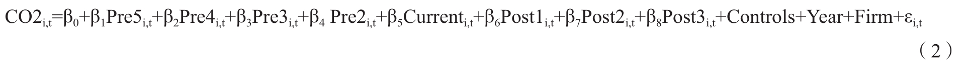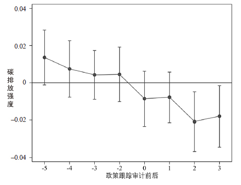 使用双重差分模型的前提是,在审计署没有进行政策落实跟踪审计的情况下,实验组与控制组的碳排放强度应当保持平行的趋势,不存在显著差异,从而保证双重差分的回归结果是由于政策落实跟踪审计行为的影响,而不是由于事前就存在的其他事项所导致的。本文参考白俊红等(2022)的做法,构建模型(2)进行平行趋势检验: