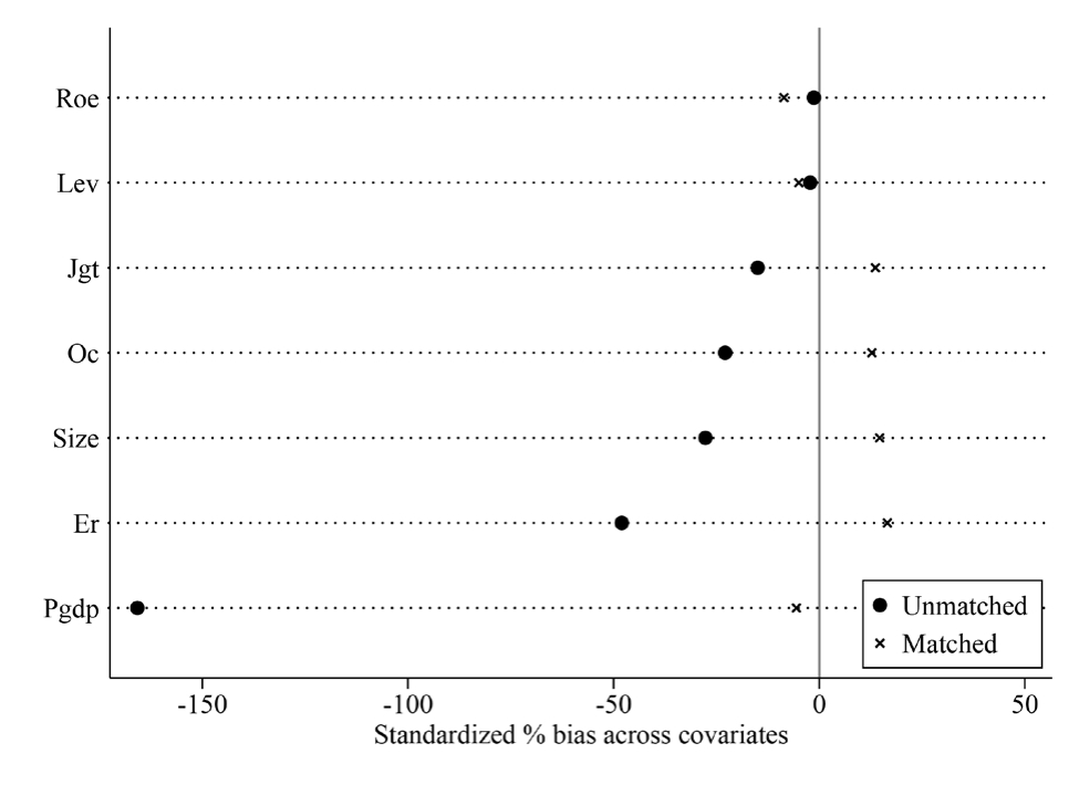 考虑研究数据方面可能存在样本选择偏误,本文采用截面PSM的方法进行稳健性检验。具体来说,将公司规模、资产负债率、盈利能力、股权集中度、机构投资者持股、人均GDP、环境规制强度设定为匹配变量,直接运用近邻匹配方法为所有实验组寻找满足共同支撑条件的最优对照组,将非共同支撑部分剔除,从而得到新数据集。PSM平衡性检验结果如图2所示,匹配效果较为良好。本文用匹配后的样本重新进行回归分析,结果如表4中的第(3)列所示,DID的系数为-0.0081,在10%水平上显著,这与基准回归结果保持一致,表明政策落实跟踪审计对企业的碳减排效应是稳健的。