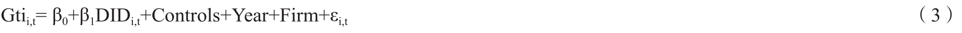 已有文献表明,企业进行绿色技术创新能够降低其碳排放,因此,参考宋德勇等(2023)、屠西伟和张平淡(2024)的做法,若验证了污染防治政策落实跟踪审计可以促进企业进行绿色技术创新,则本文假设2成立。为此,构建模型(3)来检验这一可能的机制: