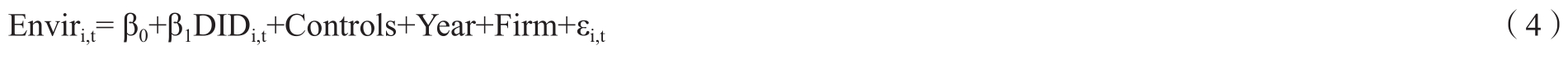 履行环境责任有助于提升企业竞争力和可持续发展能力。通过有效实施碳减排措施,切实降低碳排放水平,节余的碳排放配额还可以在碳交易市场出售,提高企业的经济效益(杜丽娟和张英华,2013)。企业积极履行环境责任能够有效降低自身碳排放水平,若能验证污染防治政策落实跟踪审计可以促进企业的环境责任履行,则本文假设3成立。为此,本文构建模型(4)来检验这一可能的机制: