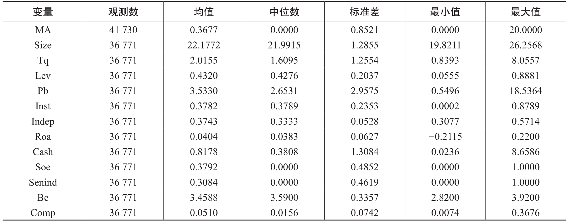 Controls表示一系列控制变量。参考石桂峰(2022)和Hossain等(2023)的研究,控制了与公司并购倾向相关的公司财务特征,具体是:公司规模(Size)、总资产收益率(Roa)、资产负债率(Lev)和现金比率(Cash)。参考Harford和Uysal(2014)以及马慧(2019)的研究,控制了公司价值(Tq)和市净率(Pb),以捕捉投资机会和股权错误估值对公司并购决策的影响。此外,还通过加入独立董事比例(Indep)和机构投资者比例(Inst),以控制公司治理特征的影响(Faccio和Masulis,2005),并加入产权性质哑变量(Soe)控制与是否国有企业相关的固有并购模式的影响。为了控制与并购决策相关的行业特征及市场环境特征,参考龚敏等(2024)的研究,加入了敏感行业哑变量(Senind)、行业竞争变量(Comp)以及营商环境变量(Be)。最后,参考Harford(2005)的研究,加入了公司和年份固定效应,控制公司层面不随时间变化的无法观测因素的影响,以及行业和宏观经济周期中固有并购模式的影响。