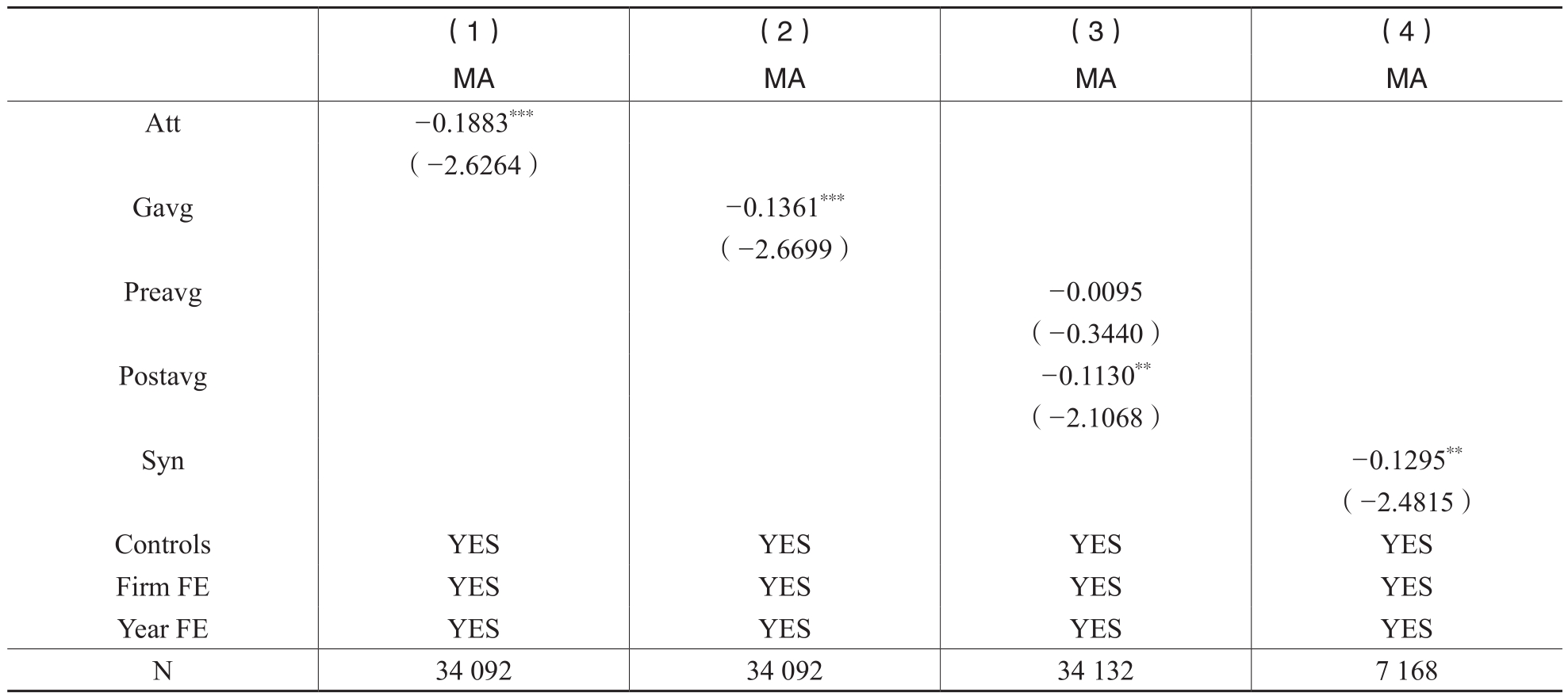 表3的控制变量结果与现有相关文献的结论基本一致。具体而言,公司规模(Size)的系数为正,表明规模较大的公司更倾向于发起并购,这与现有文献发现的“大公司通常具备更多资源来进行扩张”一致。总资产收益率(Roa)的系数也显著为正,反映了盈利能力较强的公司更有动力通过并购扩展业务范围,提升市场地位。资产负债率(Lev)与MA的正向关系表明负债较高的公司可能通过并购寻找新的融资渠道或扩展业务,以平衡其财务压力,这与现有研究中关于公司资本结构与并购倾向的关系一致。产权性质(Soe)的负向系数表明,国有企业相对于非国有企业发起并购的倾向较低,这与现有研究中关于国有企业在投资决策上相对谨慎的结论相一致(Chen等,2011)。敏感行业哑变量(Senind)的系数为负,表明处于敏感行业的公司在并购决策上更为保守,这与现有文献中关于敏感行业公司面临更多监管和政策限制的结论一致。行业竞争水平(Comp)的系数为正,表明在竞争较少的行业中,公司可能通过并购进一步巩固市场地位或减少竞争压力。同时,由于面临更低的风险,竞争较弱行业的公司并购活动也更加积极(彭家乐等,2025)。