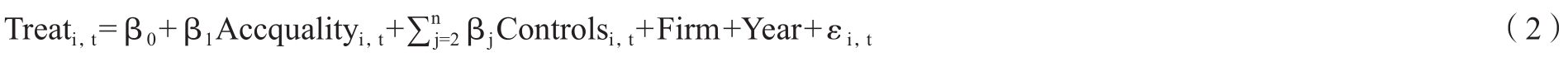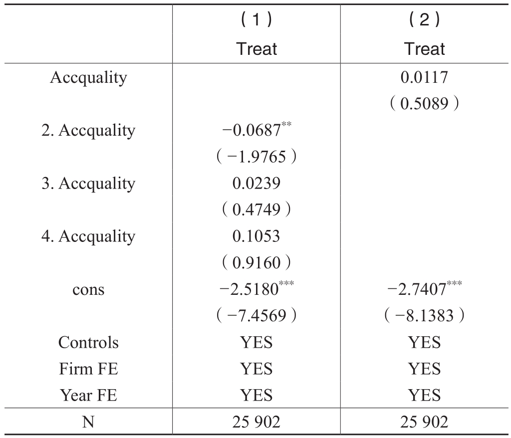 其中,Accquality代表公司的信息披露质量,以年度的公司信息披露评分结果衡量。评分结果分为四个类别,由类别1至类别4,信息披露质量依次递减。Treat代表公司是否为适用政策的公司,适用则取1,否则取0。其余变量与模型(1)一致。