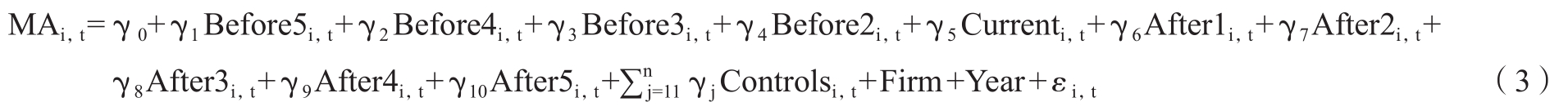 本文进行的多期双重差分研究设计的有效性,依赖于政策出台前处理组和控制组的并购发起模式不存在明显差异。因此,为验证政策出台前的平行趋势假定,参考Chen等(2021)以及王钟阳和唐松(2024)的方法,建立动态效应模型如式(3)所示: