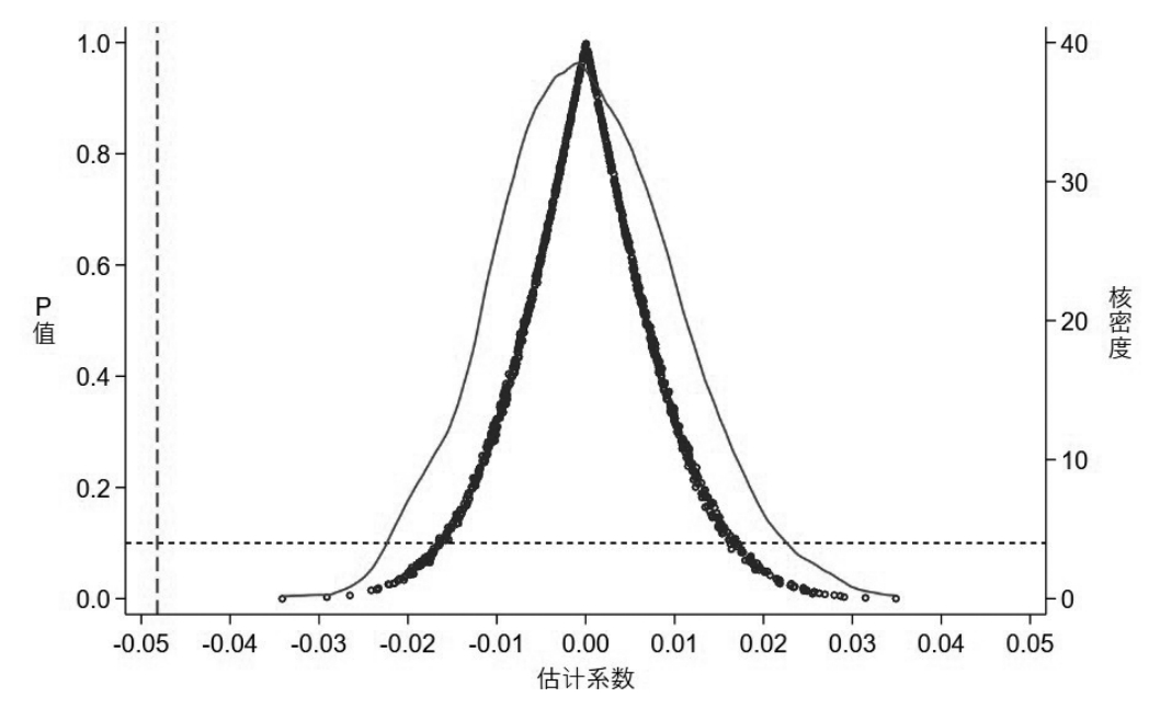 安慰剂检验结果如图2所示,圆点代表了随机政策处理下估计系数对应的P值,曲线为核密度估计,反映了在随机政策处理下估计系数的分布形态。可见,大多数随机政策处理下的估计系数集中在0附近,显示随机因素并不会产生显著的估计结果。同时,本文前述的真实估计系数(竖虚线)显著偏离核密度的峰值。这表明行业经营性信息披露对企业并购行为的影响并非由不可观测的随机因素驱动。安慰剂检验的结果支持了本文主要结论的稳健性。