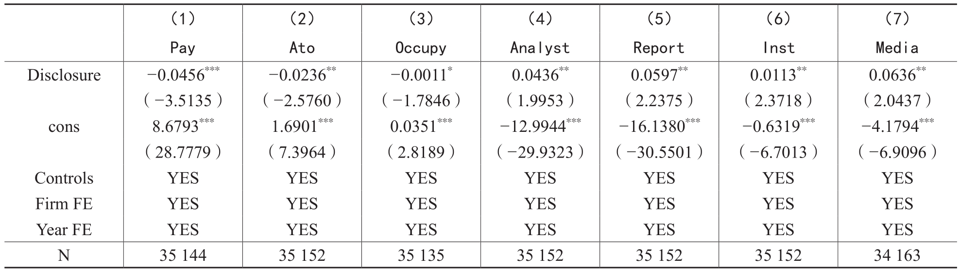 上述稳健性检验的结果如表8所示。表8的第(1)列报告了将模型(1)的被解释变量取自然对数后进行估计的基准回归结果。第(2)列则报告了将被解释变量替换为二元哑变量后,采用固定效应logit方法对模型(4)进行估计的结果。第(3)列和第(4)列则是剔除特殊年份的观测值后,分别对模型(1)和模型(4)进行估计的结果。上述的模型估计中均加入了与模型(1)相同的控制变量,同时控制了公司和年份双重固定效应。根据表中所列示的结果,核心解释变量Disclosure的系数符号均为负且显著,即本文的主要结论在这项测试中具有稳健性。